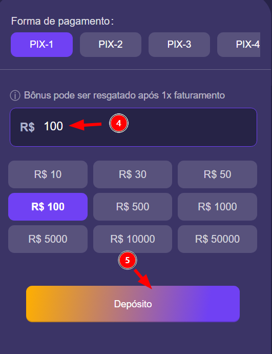 Passo 4: Escolha o valor que deseja depositar ou insira manualmente o valor desejado. Em seguida, clique em “Depósito” para acessar imediatamente a página de pagamento via QR Code.